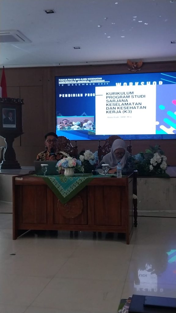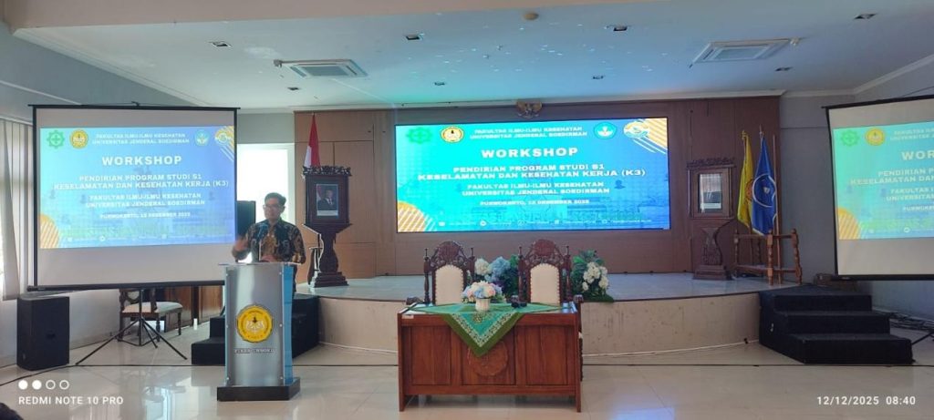 PURWOKERTO – Fakultas Ilmu-Ilmu Kesehatan (FIKes) Universitas Jenderal Soedirman (UNSOED) hari ini, Selasa, 12 Desember 2025, sukses menyelenggarakan Workshop Pendirian Program Studi Sarjana Keselamatan dan Kesehatan Kerja (K3). Kegiatan yang dilaksanakan secara hybrid dari pukul 08.00 hingga 16.00 WIB ini—berpusat di Aula Dekanat FIKes dan terhubung melalui Zoom Meeting—menjadi tahapan krusial dalam upaya FIKes UNSOED menjawab urgensi kebutuhan tenaga kerja K3 yang unggul dan adaptif.