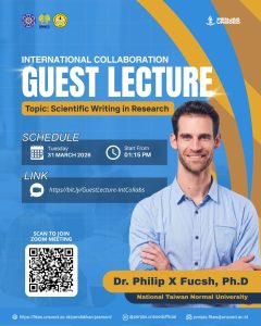 Kegiatan yang dilaksanakan secara daring pada Selasa, 31 Maret 2026 pukul 13.15 WIB ini menghadirkan narasumber internasional, Dr. Philip X. Fuchs, Ph.D, dosen dan peneliti dari National Taiwan Normal University, yang memberikan pemaparan mendalam mengenai teknik penulisan artikel ilmiah yang efektif untuk menembus jurnal bereputasi internasional.