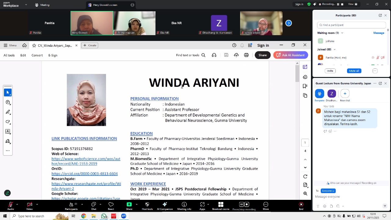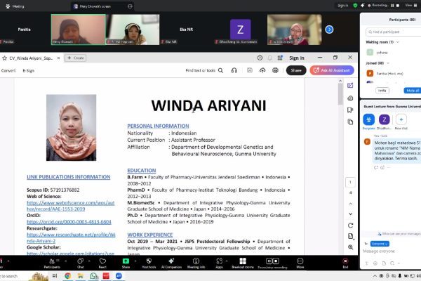 Pada hari Senin, telah dilaksanakan kuliah tamu yang menghadirkan apt. Winda Ariyani Ph.D., Alumni Jurusan Farmasi Unsoed Angkatan 2008, yang saat ini bekerja sebagai Assistant Professor di Department of Developmental Genetics and Behavioural Neuroscience, Gunma University, di Jeang. Kuliah tamu ini mengangkat tema tentang Tinjauan Farmakogenomik pada Kondisi Obesitas dan dimoderasi oleh Dosen Farmasi Unsoed, Heny Ekowati, Ph.D.