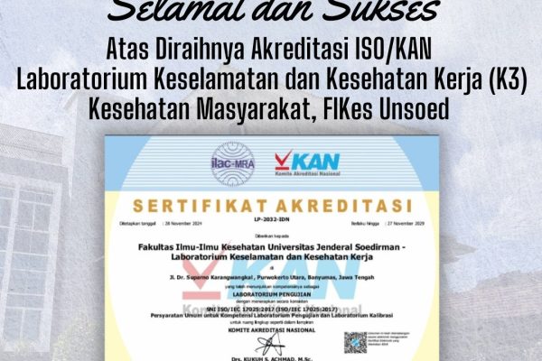 Laboratorium Kesehatan dan Keselamatan Kerja (K3) Program Studi Kesehatan Masyarakat, Fakultas Ilmu-Ilmu Kesehatan (FIKes) berhasil meraih akreditasi ISO/KAN. Pencapaian ini menunjukkan bahwa laboratorium K3 Unsoed telah memenuhi standar internasional dalam sistem manajemen mutu dan kompetensi teknis. Akreditasi ini dikeluarkan oleh Komite Akreditasi Nasional (KAN) sebagai pengakuan atas kualitas layanan pengujian laboratorium yang memenuhi standar global. … Lanjutkan membaca Laboratorium K3 Kesehatan masyarakat terakreditasi ISO/KAN