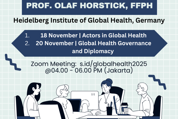 PURWOKERTO – Program Studi Magister Kesehatan Masyarakat (Kesmas) Fakultas Ilmu-Ilmu Kesehatan (FIKes) Universitas Jenderal Soedirman (UNSOED) sukses menggelar sesi pertama kegiatan Visiting Professor bersama pakar kesehatan global dari Jerman, Prof. Olaf Horstick, FFPH. Profesor dari Heidelberg Institute of Global Health, Germany ini hadir secara daring pada hari Senin, 18 November 2025, membahas topik krusial: “Actors … Lanjutkan membaca Memperluas Wawasan Kesehatan Global, S2 Kesehatan Masyarakat Fikes Unsoed Selenggarakan Kuliah Visiting Professor bersama Prof. Olaf Horstick dari Heidelberg Institute of Global Health