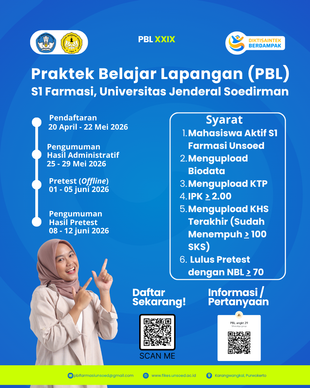 Program Studi S1 Farmasi Universitas Jenderal Soedirman dengan ini mengumumkan pembukaan kegiatan Praktek Belajar Lapangan (PBL) Angkatan XXIX Tahun 2026. Kegiatan ini merupakan bagian dari kurikulum yang bertujuan untuk meningkatkan kompetensi mahasiswa melalui pembelajaran berbasis praktik di lapangan.