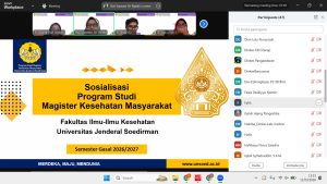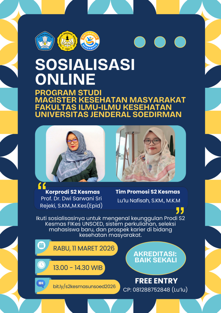 Purwokerto – Program Studi Magister Kesehatan Masyarakat (S2 Kesmas) Fakultas Ilmu-Ilmu Kesehatan Universitas Jenderal Soedirman (FIKes UNSOED) menyelenggarakan kegiatan Sosialisasi Online Program Studi S2 Kesehatan Masyarakat pada Rabu, 11 Maret 2026 melalui platform Zoom. Kegiatan ini dilaksanakan sebagai bagian dari upaya promosi akademik serta penyebarluasan informasi mengenai peluang studi lanjut di bidang kesehatan masyarakat.