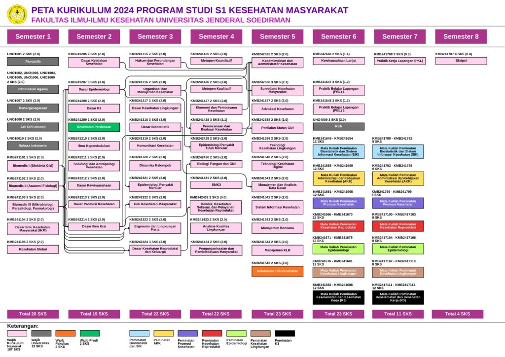 22 | Ketentuan Lulus | Mahasiswa Prodi S1 Kesehatan Masyarakat dinyatakan lulus apabila telah menempuh minimal 144 SKS yang terdiri dari 107 SKS kurikulum nasional kesehatan masyarakat yang ditetapkan oleh AIPTKMI, 17 SKS mata kuliah wajib universitas, fakultas, dan prodi, serta 20 SKS mata kuliah pilihan masing-masing peminatan. |