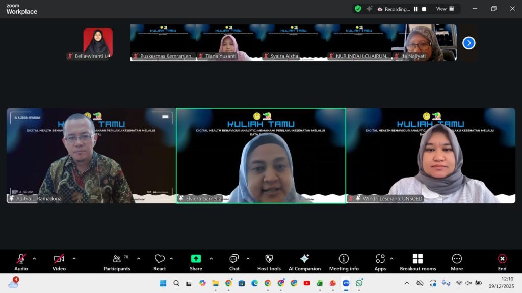 PURWOKERTO – Jurusan Kesehatan Masyarakat Fakultas Ilmu-Ilmu Kesehatan (FIKes) Universitas Jenderal Soedirman (UNSOED) sukses menyelenggarakan Kuliah Tamu spesial bertajuk “Digital Health Behaviour Analytic: Memahami Perilaku Kesehatan Melalui Data Digital” pada hari Selasa, 9 Desember 2025. Kegiatan online yang dilaksanakan melalui platform Zoom dan disiarkan langsung melalui YouTube ini diikuti secara antusias oleh civitas akademika FIKes dan berbagai peserta dari luar institusi, sebagai bentuk adaptasi akademik terhadap dinamika kesehatan di era modern.